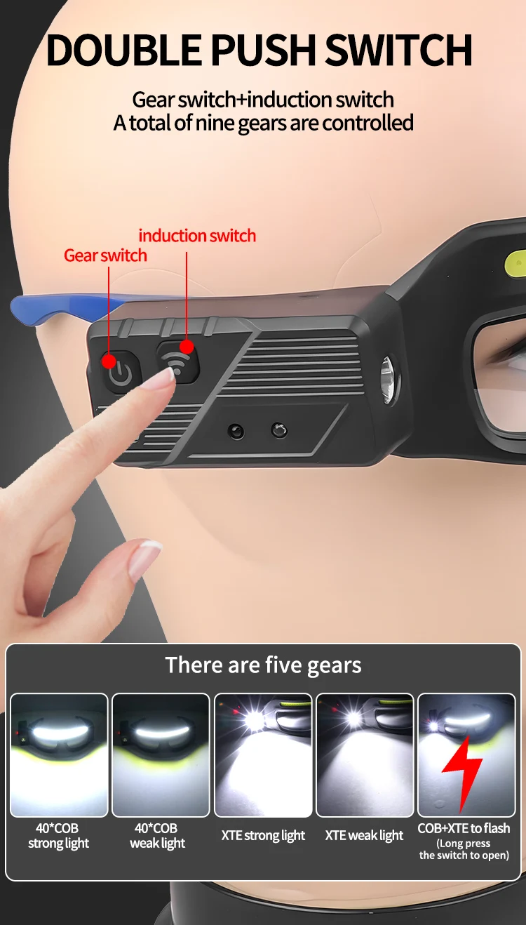 Features: Multi-functional glasses light, can switch between near and far beams, can sense